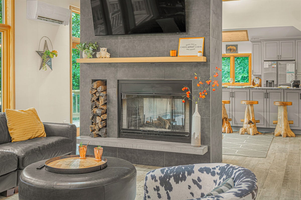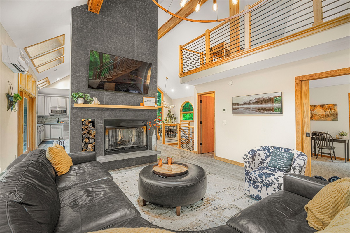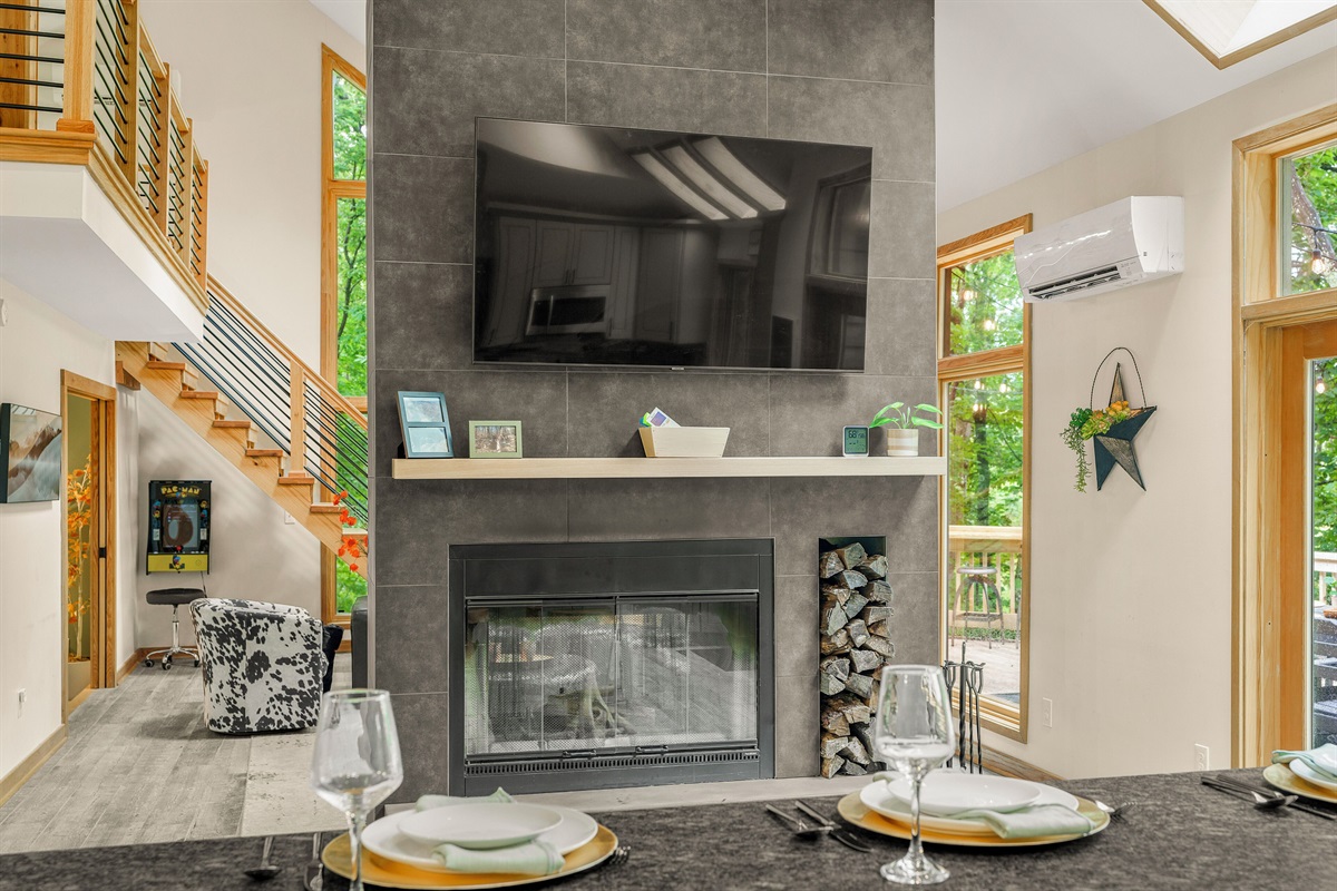 - Living room with wood burning fireplace (firewood provided), 65" smart TV, and arcade machine