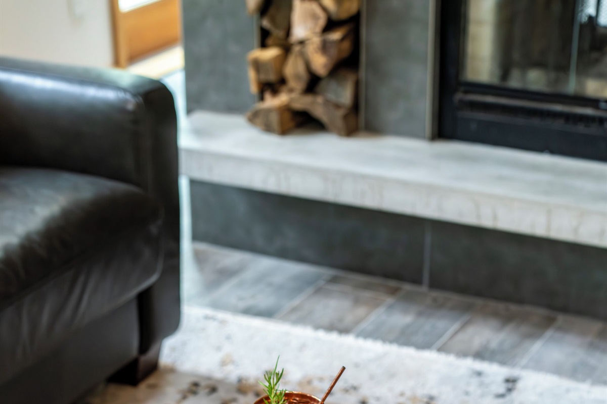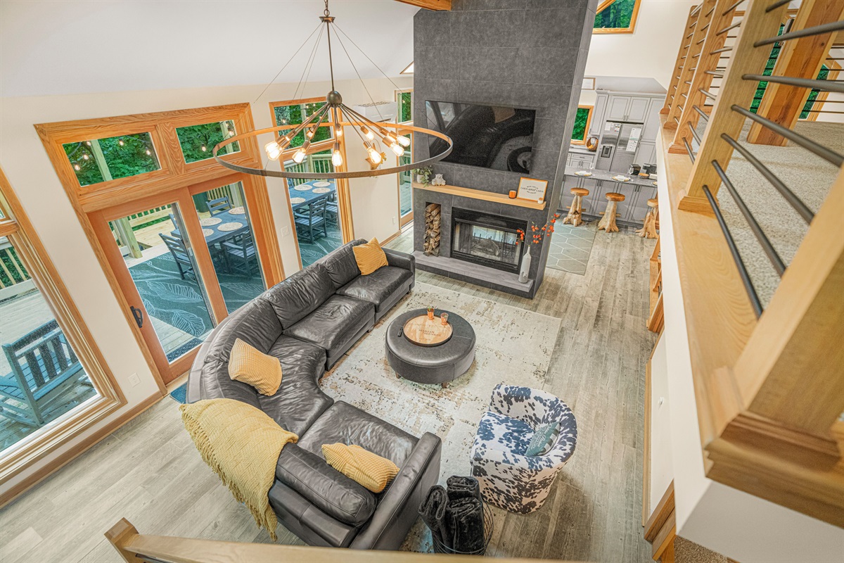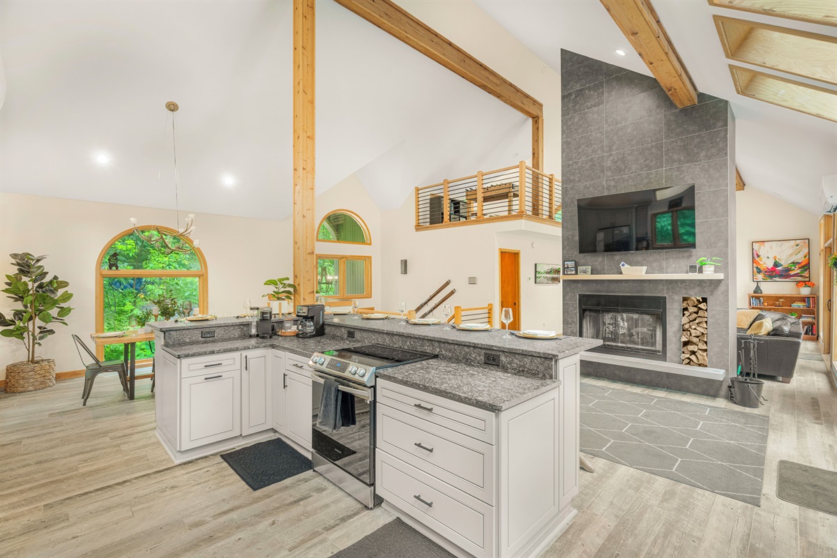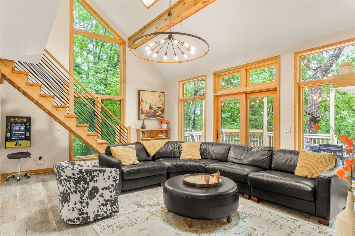 - Living room with wood burning fireplace (firewood provided), 65" smart TV, and arcade machine