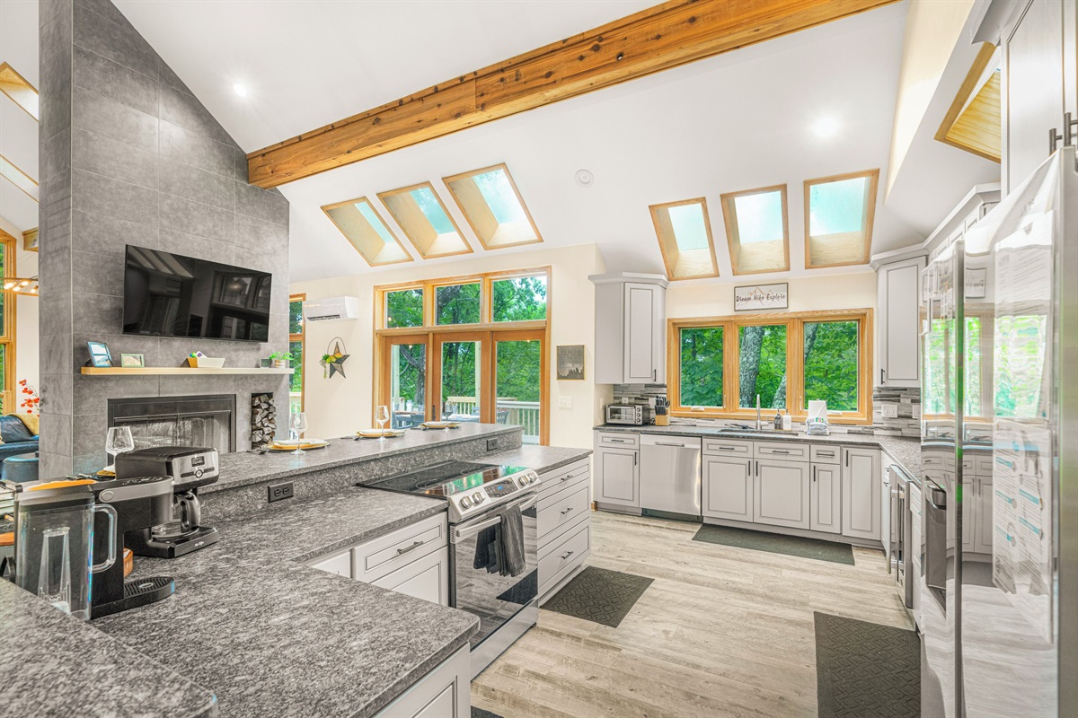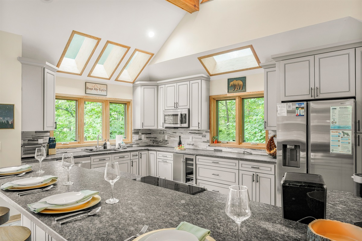 - Newly renovated, oversized, and fully stocked kitchen with custom teak root stools surrounding island