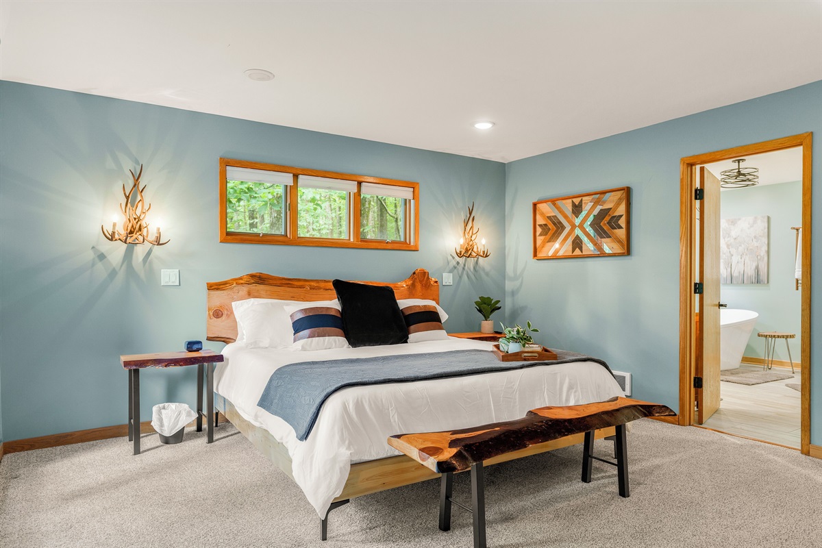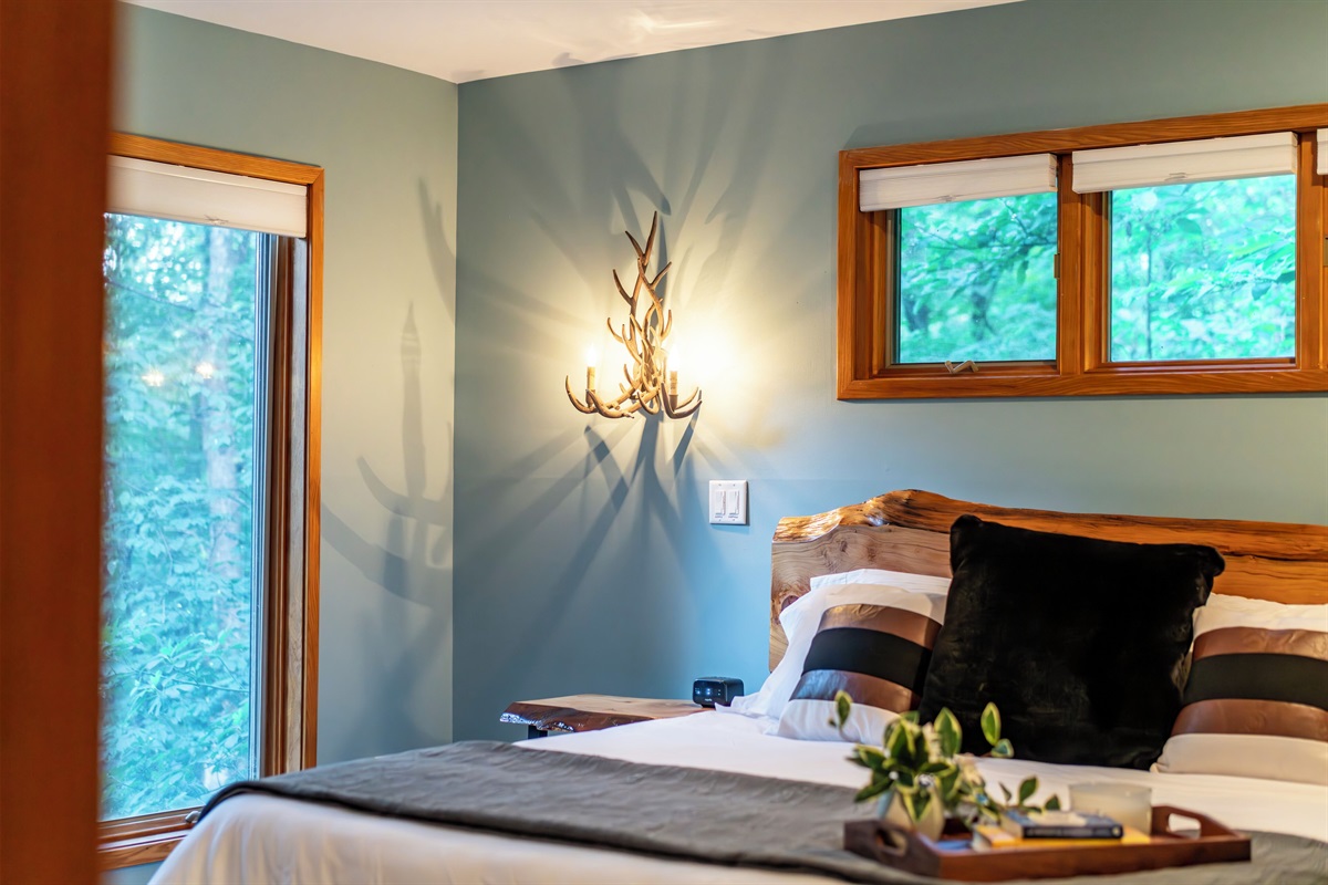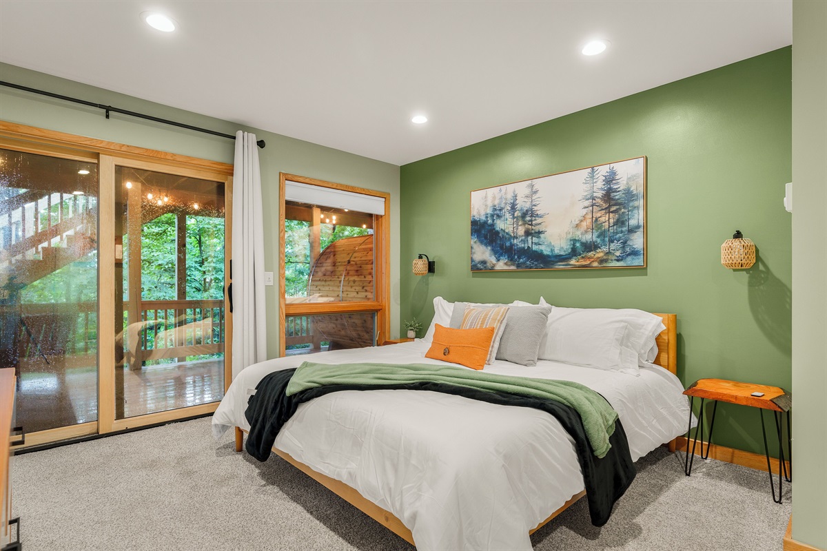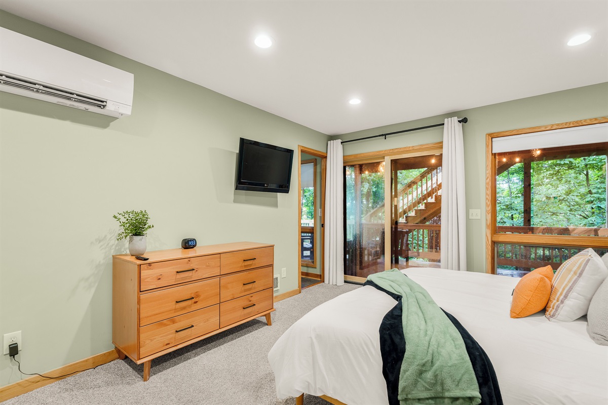 - BR2: Master bedroom with king bed and deck access.