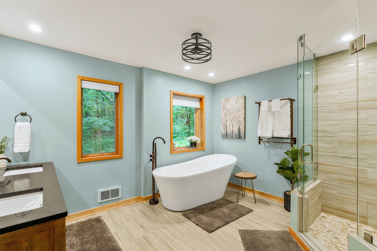 - Ensuite bathroom of BR2, fully renovated with double vanity, tiled shower, and soaker tub