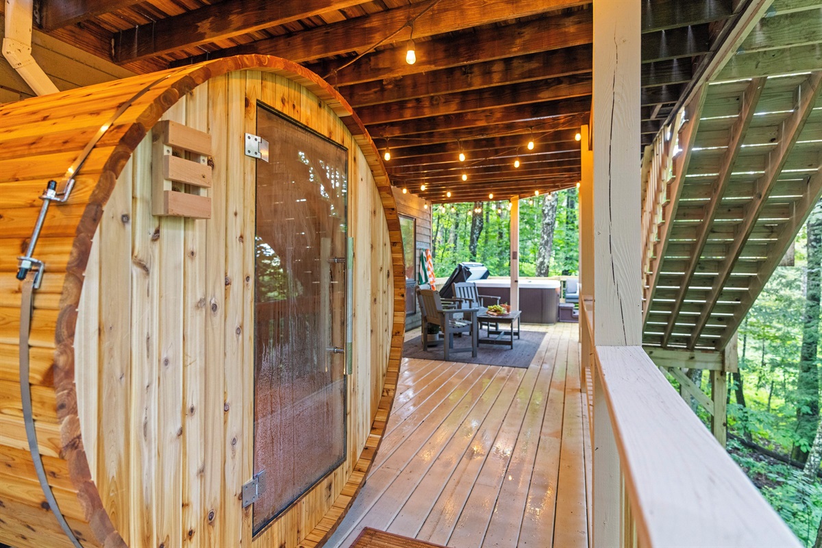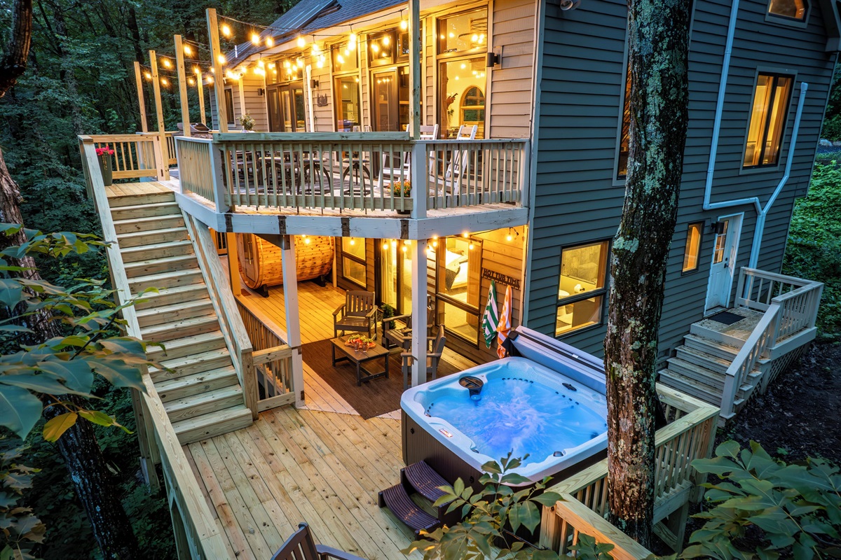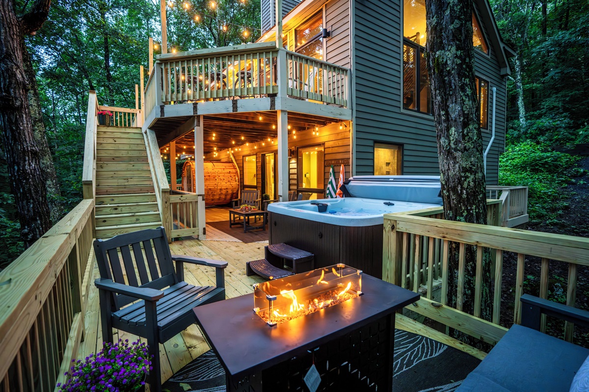- Lower deck features new hot tub, barrel sauna, fire table (propane provided), and additional outdoor seating