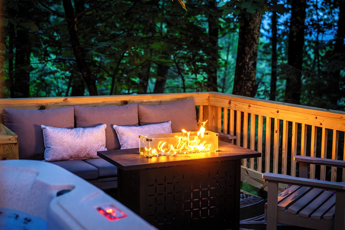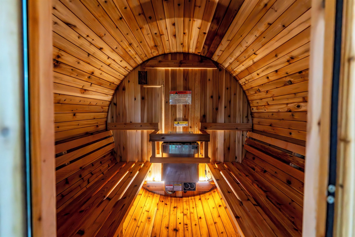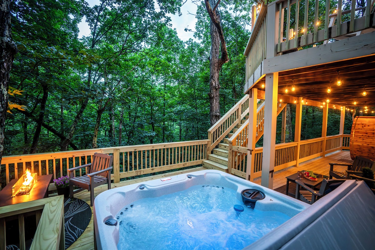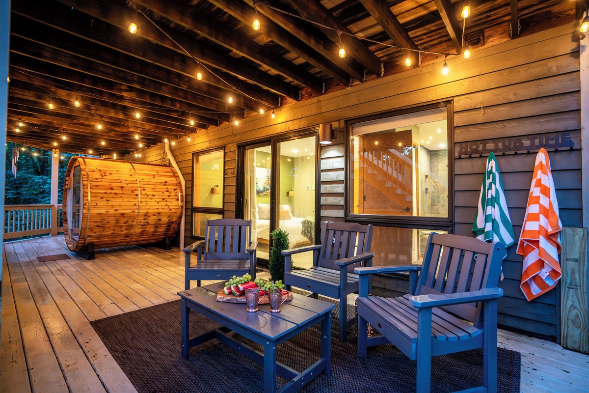 - Lower deck features new hot tub, barrel sauna, fire table (propane provided), and additional outdoor seating