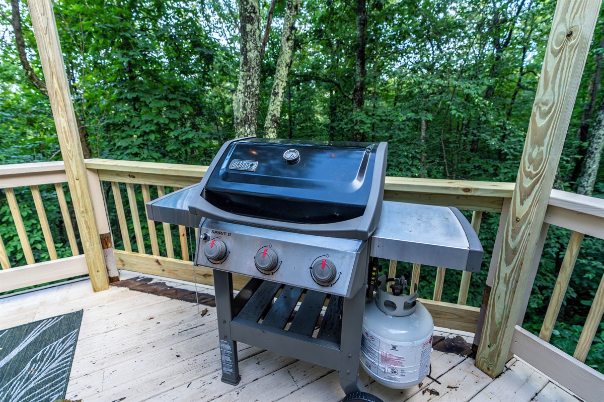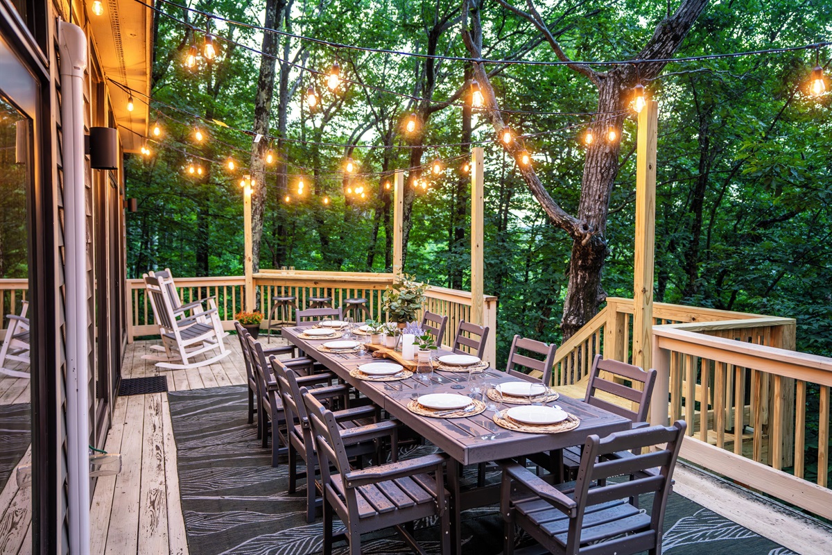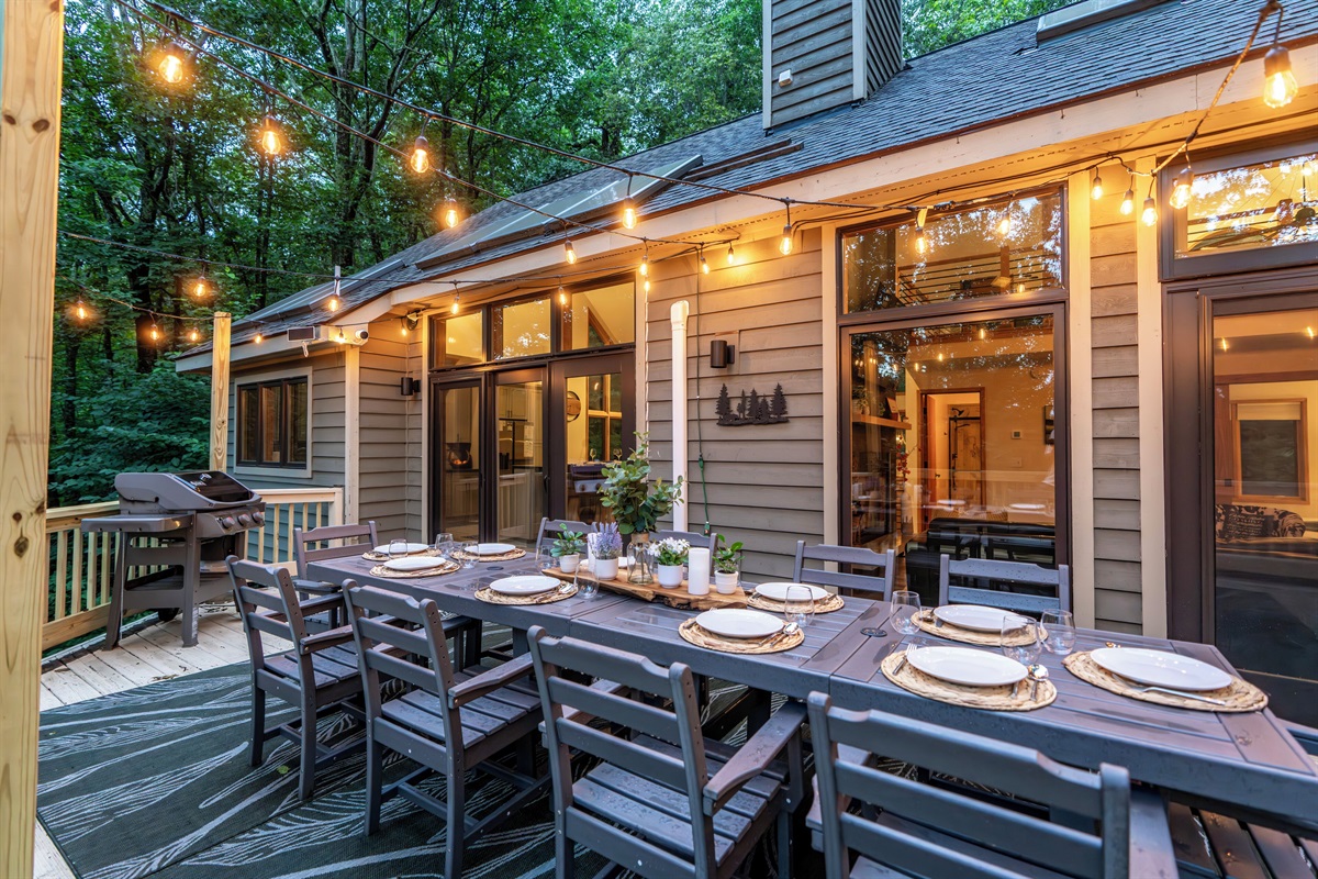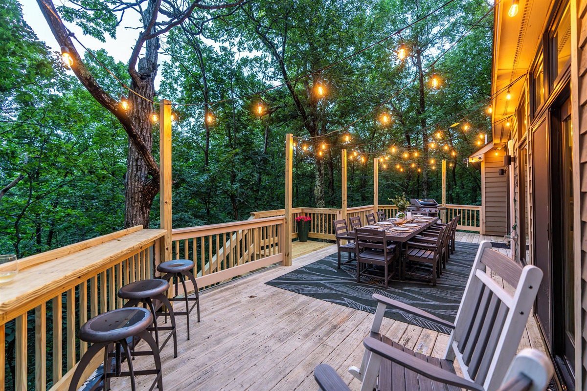 - Main level deck features outdoor dining for 10, gas grill, rocking chairs, and bar seating