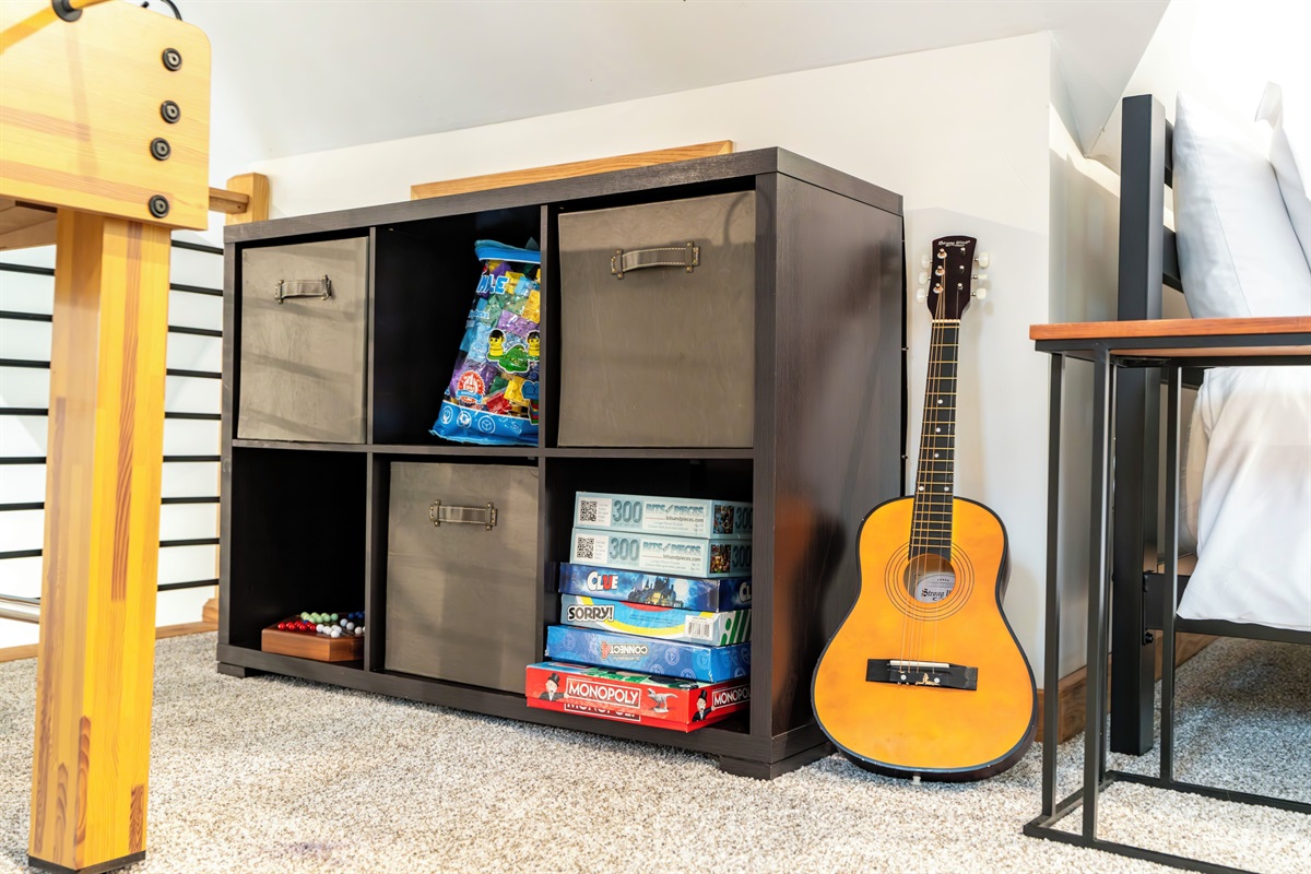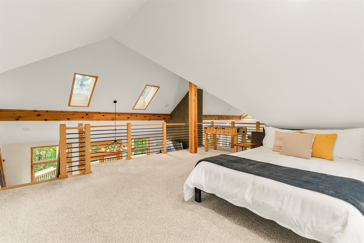 - The Loft area is set up as Bedroom 5, but note that it is open to the living room area so not completely private. This room features a queen bed, smart TV, foosball table, and various games