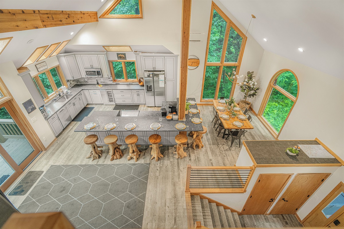 - Dining area features custom live edge table with seating for 6, plus room for 8 more at the kitchen island (14 seats total)